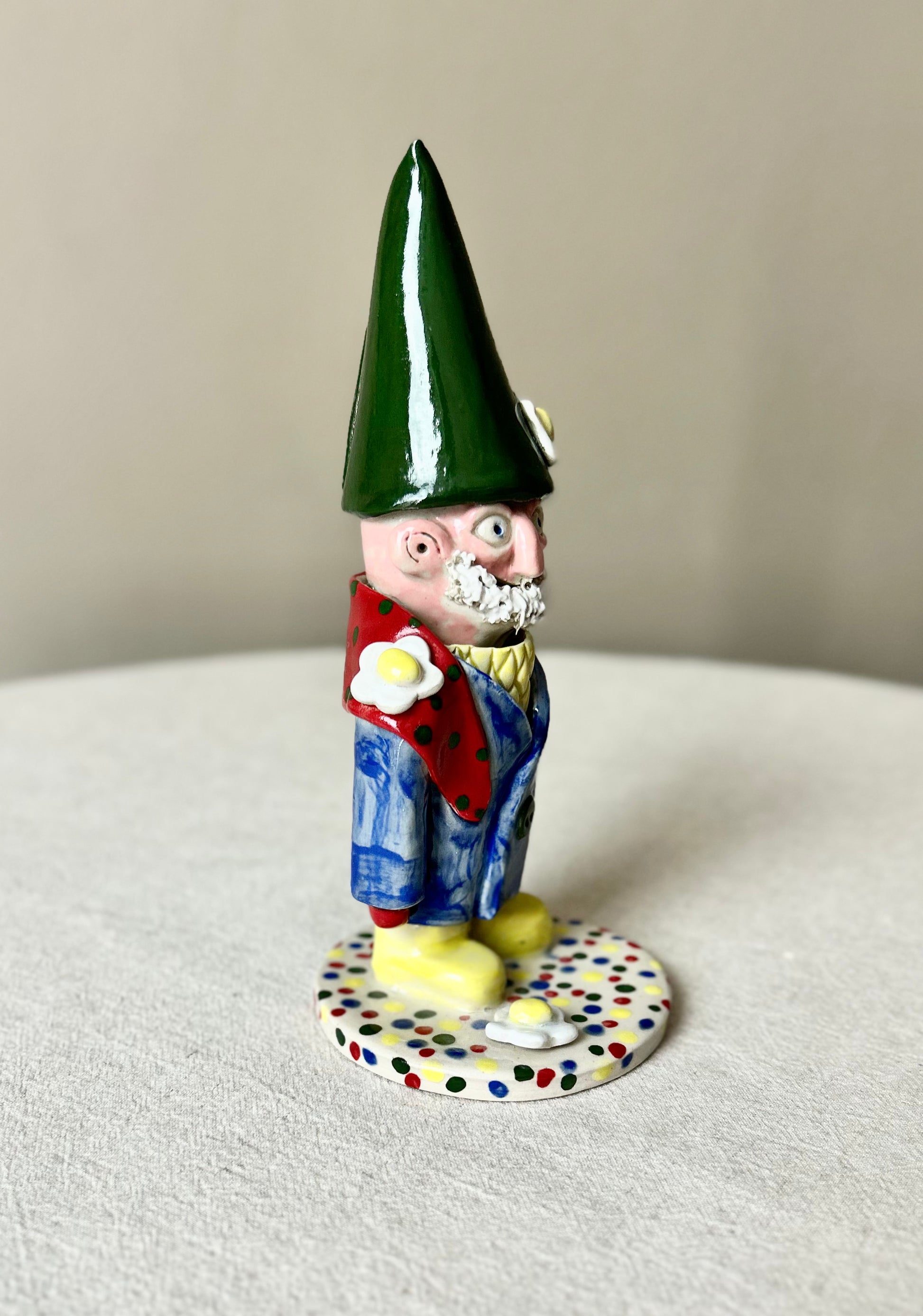 A ceramic garden gnome. Gnomes are guardian angels so perfect for keeping you safe all year around. Wearing a long green, yellow spotted scarf. Slab built from stoneware clay and fired to 1250 degrees so should be fine living inside or out.