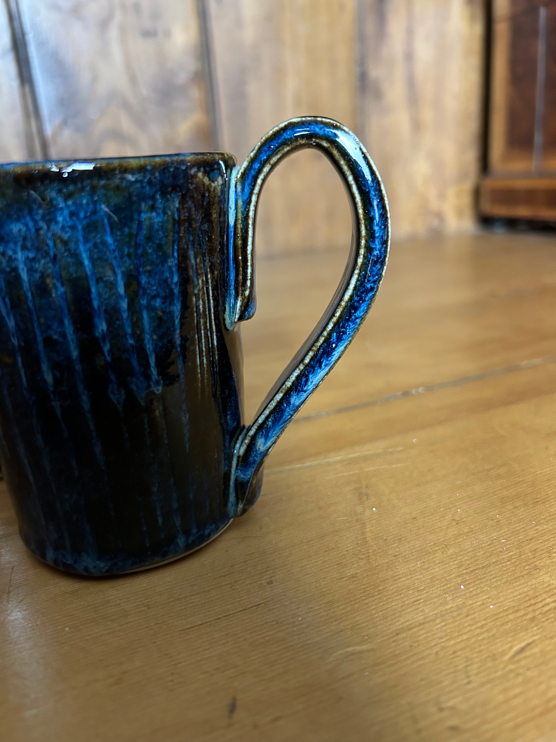 Medium sized blue gazed mugs with a slight ribbed texture on the outside. Thrown on the wheel and finished by hand. Fired to 1250 degrees. Food safe and can go in the dishwasher.