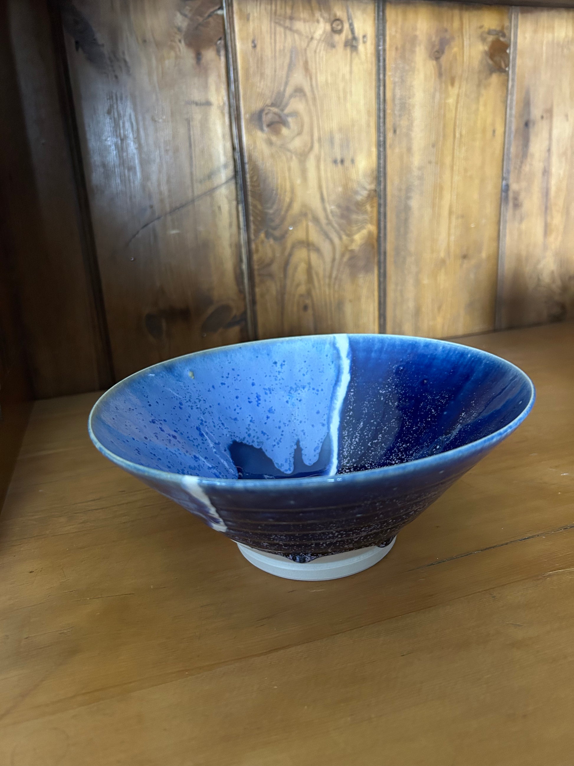 Mottled blues speckled with white. A serving bowl which would work just as well for noodles or pasta. Thrown on the wheel from stoneware clay and trimmed by hand. Slightly textured on the outside. Fired to 1250 degrees. Food safe and fine in the dishwasher.
