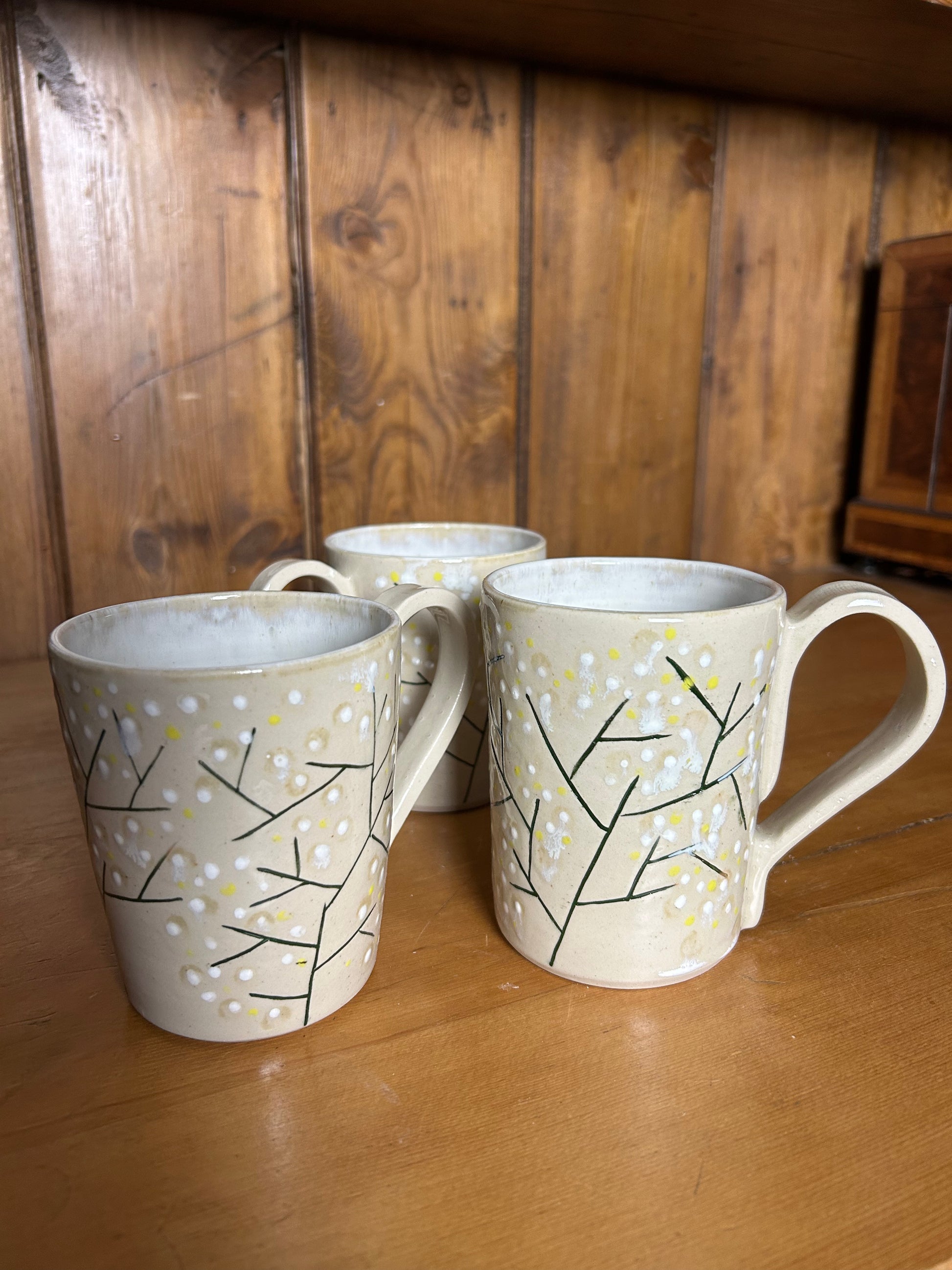 Large tea mugs decorated with a snowy winter wonderland theme outside. Made from stoneware clay. Thrown on the wheel and trimmed by hand. Fired to 1250 degrees and food safe. Fine to go in the dishwasher.