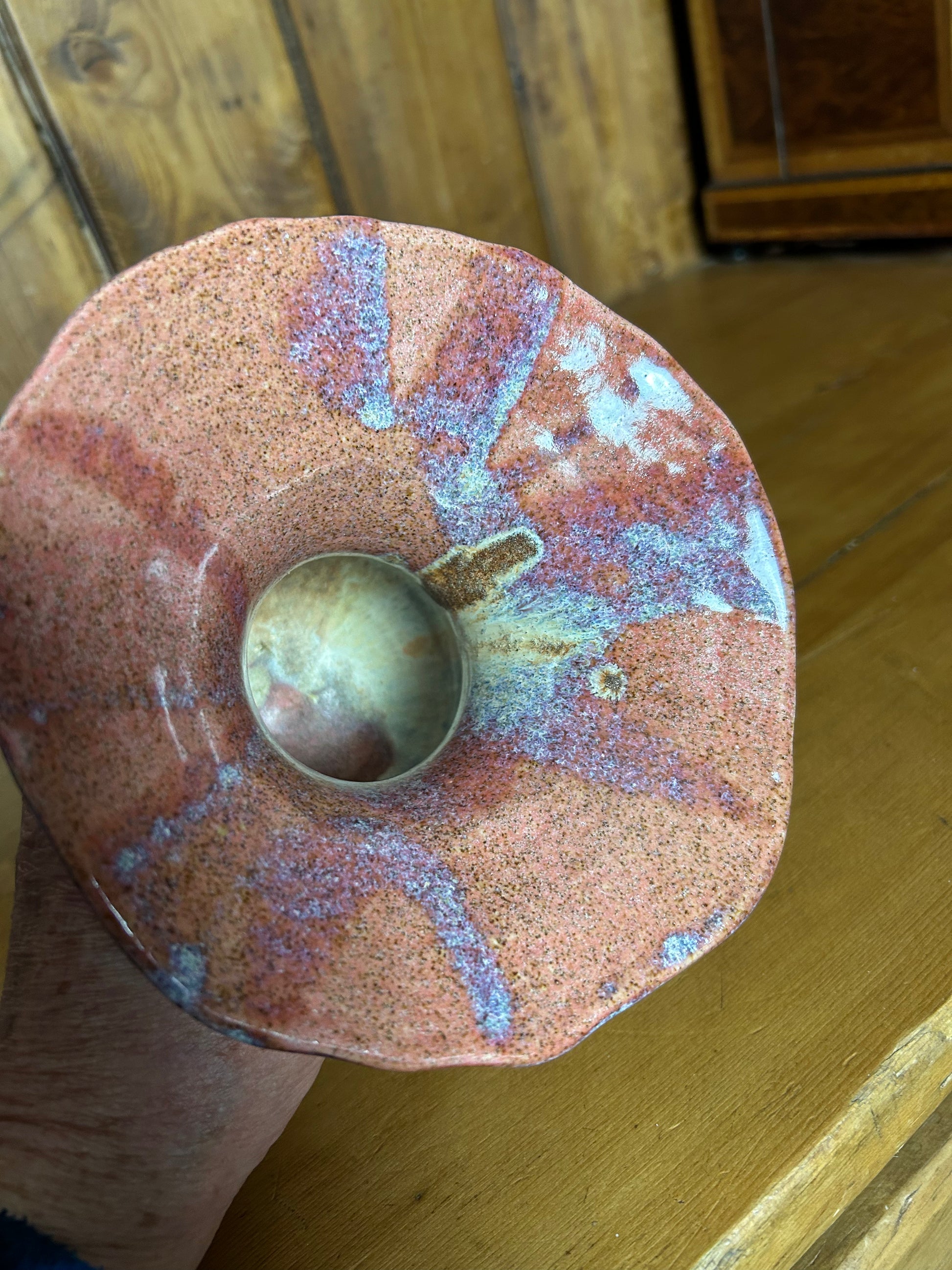 A medium sized vase with a wide fluted rim. With a rose and amber glaze inside. The base is thrown on the wheel and the fluted top section is added using multiple coils of clay. Will hold water. Made from stoneware and fired to 1250 degrees.