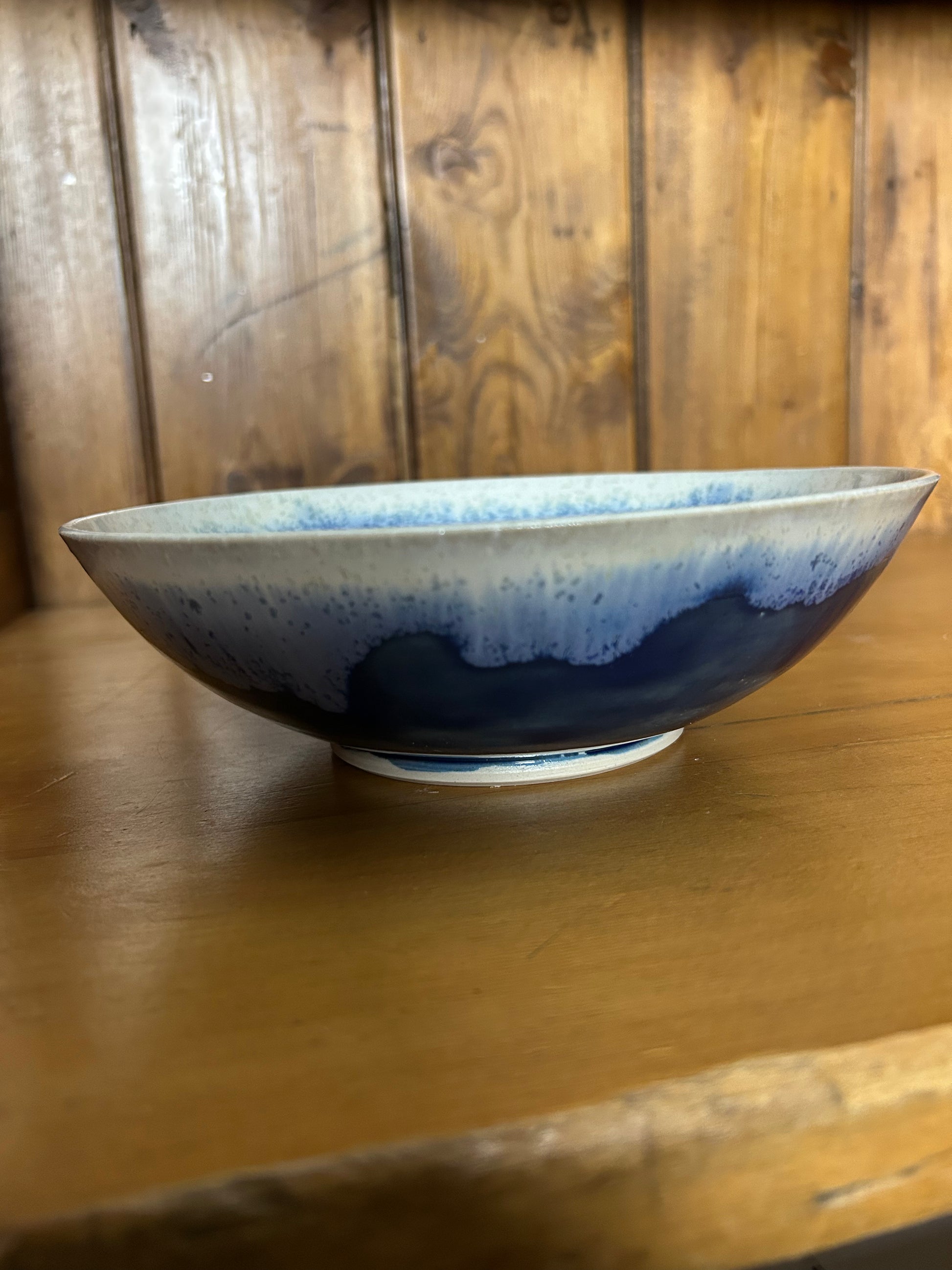 A medium sized bowl with a vibrant blue glaze inside combined with a white elder glaze ending up with the two colours flowing into each other. Fired to 1250 degrees. Thrown on the wheel and trimmed by hand. Food safe and can go in the dishwasher.
