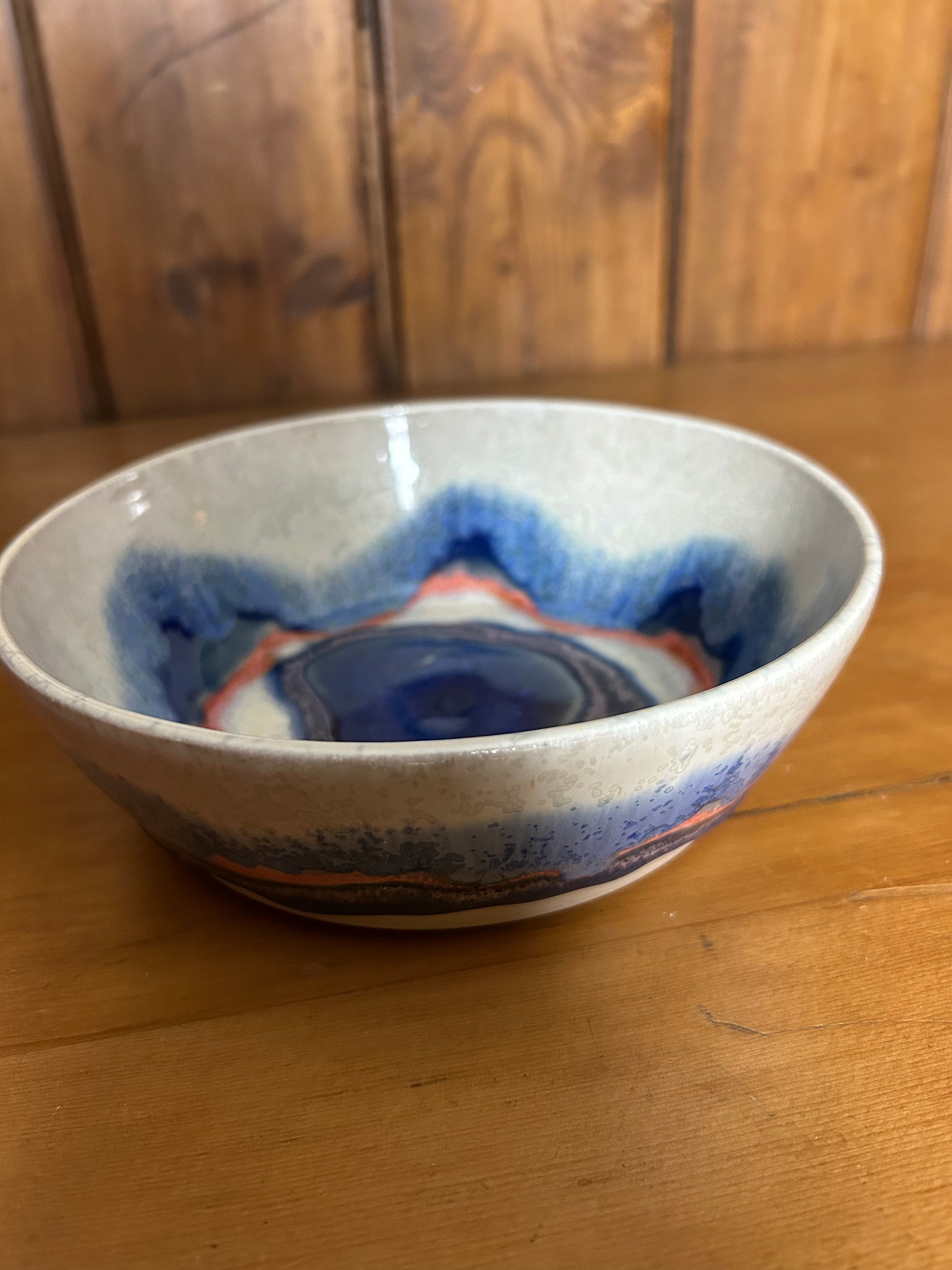 A medium sixed pasta bowl glazed the blues and white with flecks of pink. Fired to 1250 degrees and fully food safe. Can be put in the dishwasher.