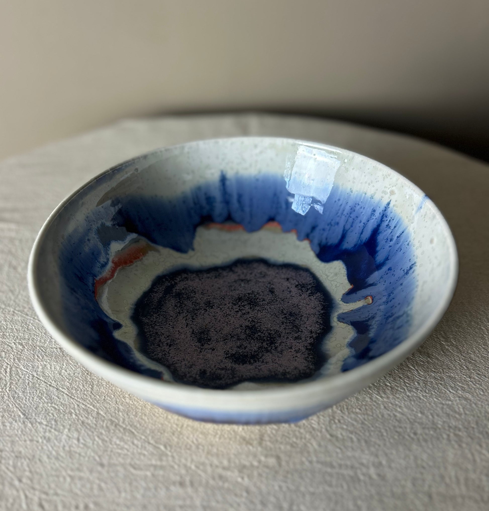 A shallow bowl glazed in blues, white and flecks of pink, inspired by the beaches of Gower in South Wales where I was brought up. This could be used as a serving bowl but also could work for pasta or noodles - anything! Thrown on the wheel and trimmed by hand. Fired to 1250 degrees. Food safe and fine in the dishwasher.