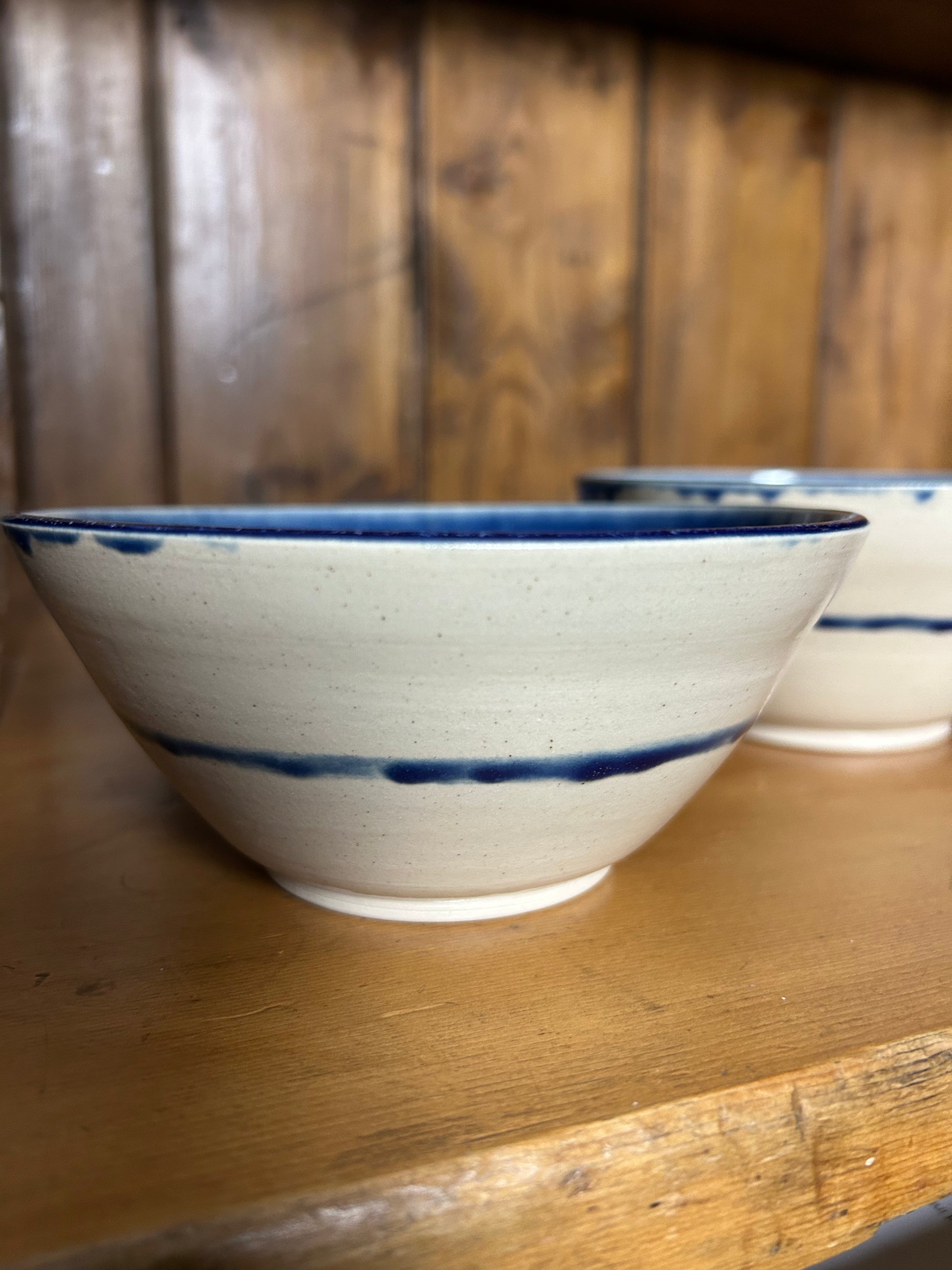Small bowls with a blue mottled glaze inside and a single thin line to decorate the outside. Made from stoneware clay. Thrown on the wheel and trimmed by hand. Fired to 1250 degrees. Food safe and can go in the dishwasher.