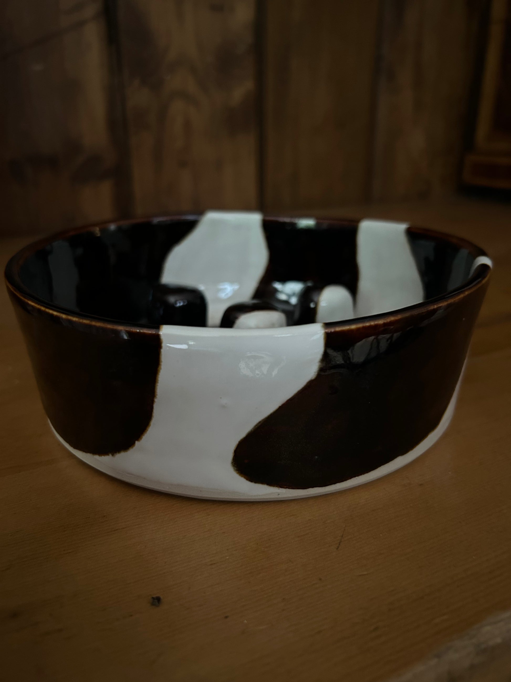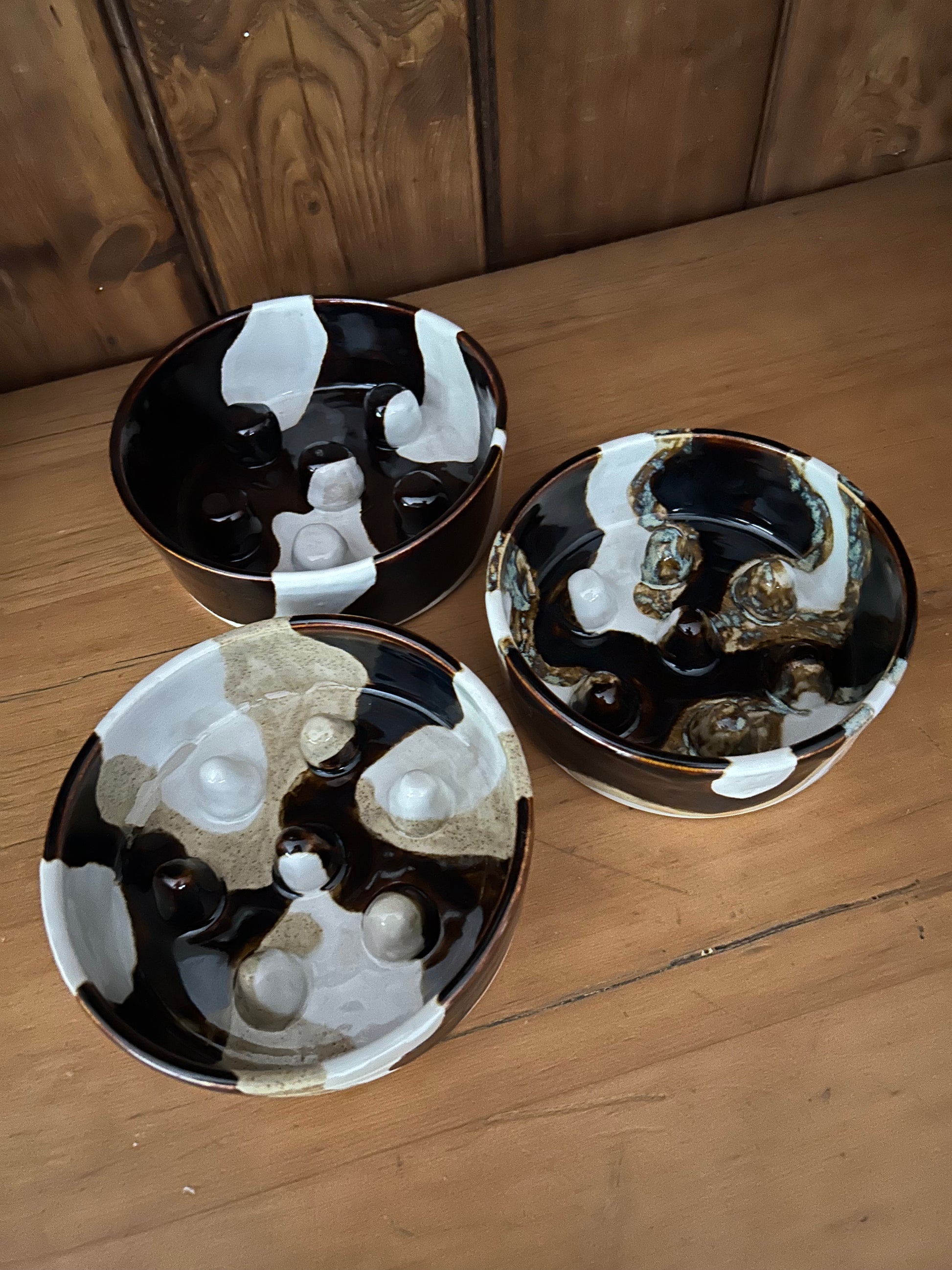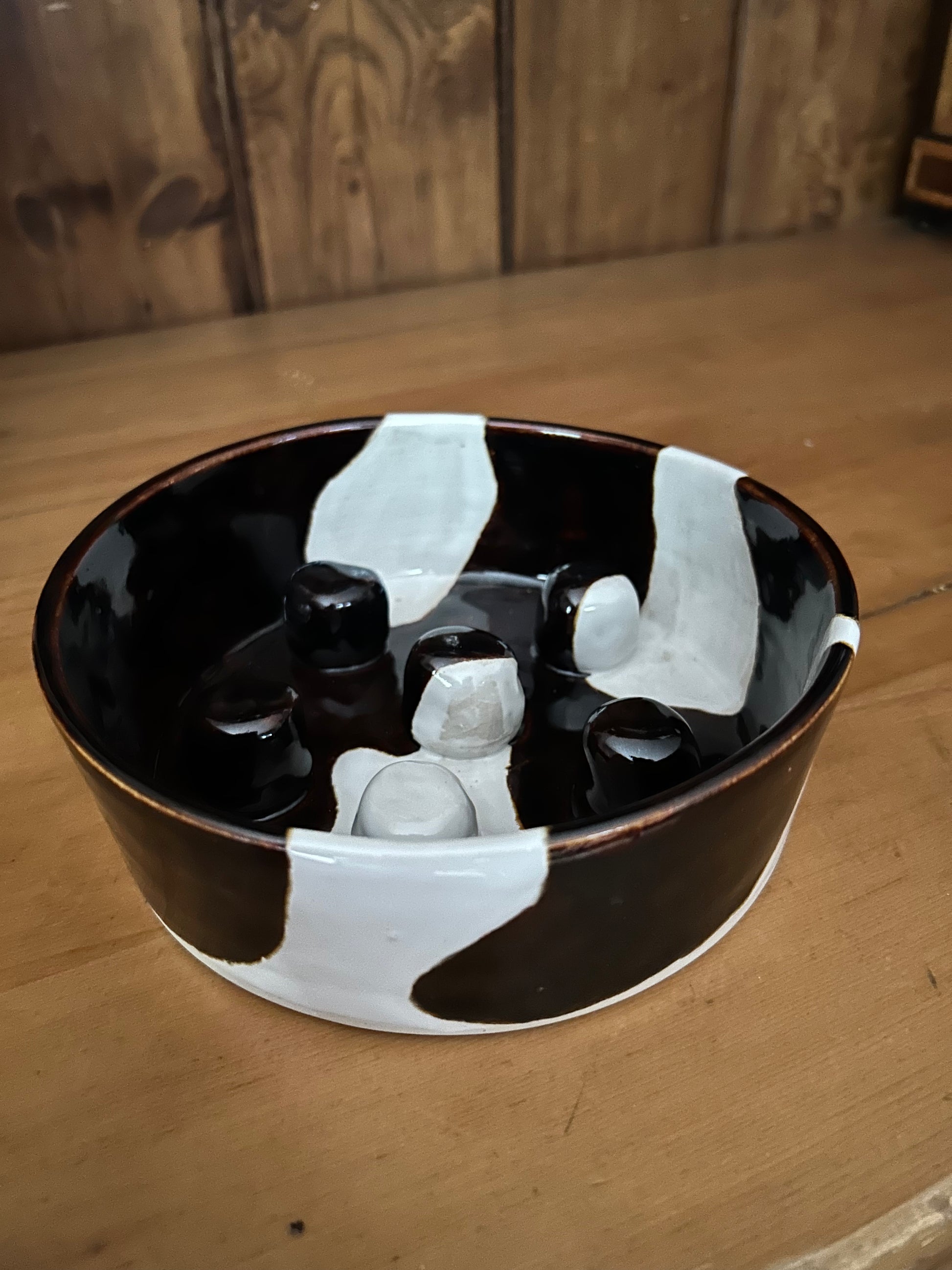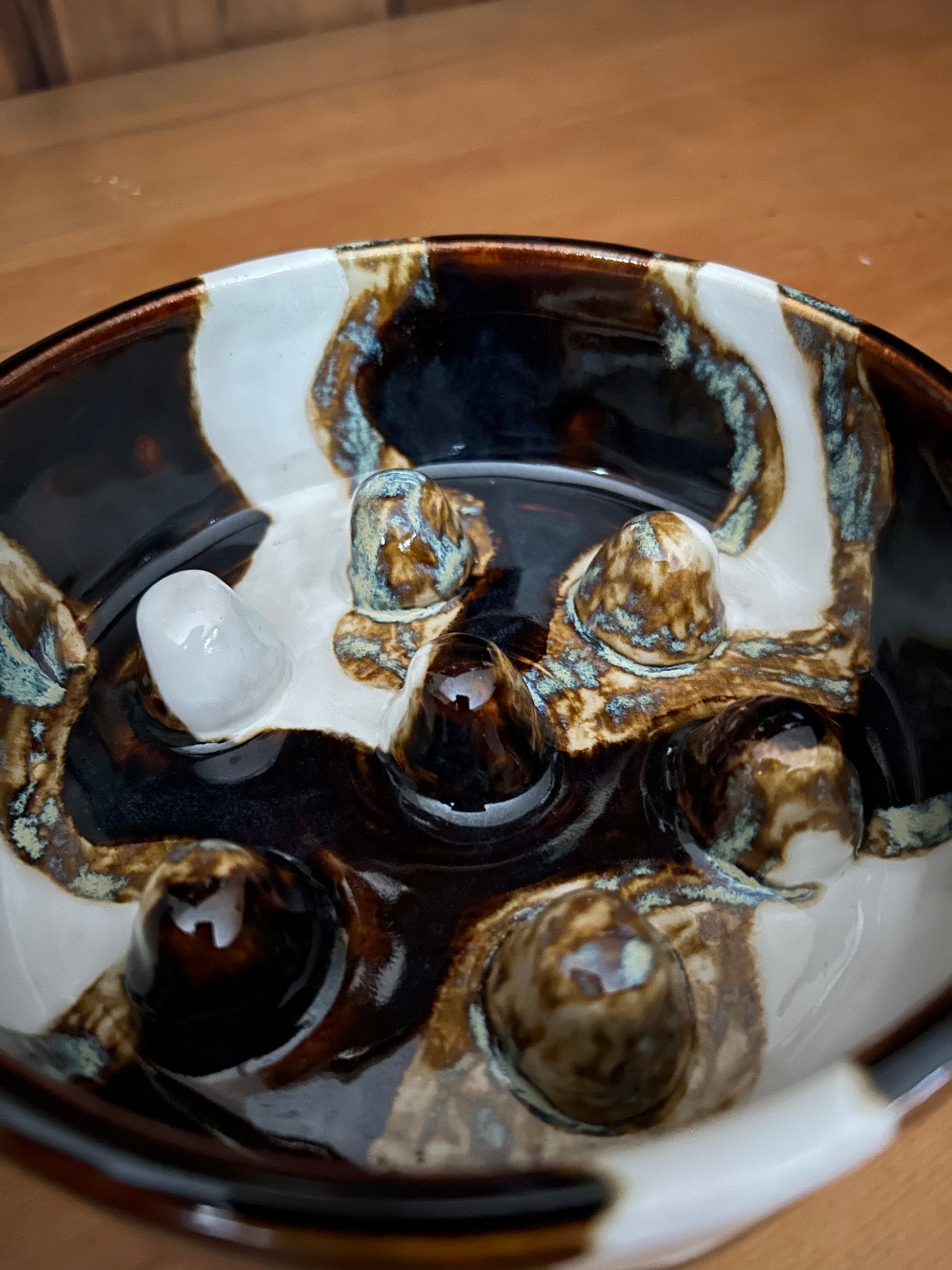 A large snuffle dog bowl. Just press the food gently between the "knobs" and it slows down the rate you dog eats. Tried and tested and it works. Thrown by hand on the wheel and finished by hand. Let me know what colour your dog is and I can glaze the bowl to match. Fired to 1250 degrees. Food safe and can be put in the dishwasher.