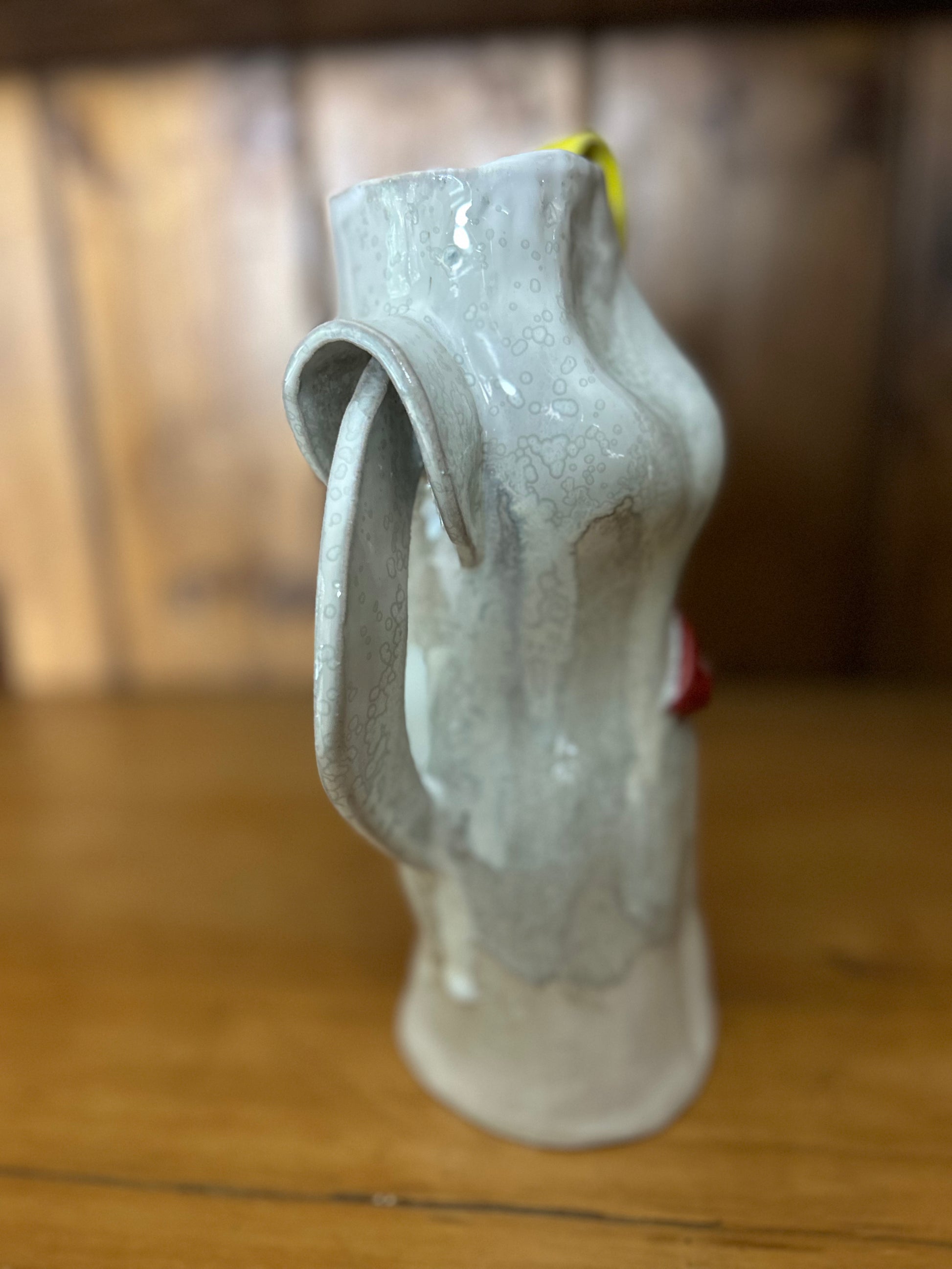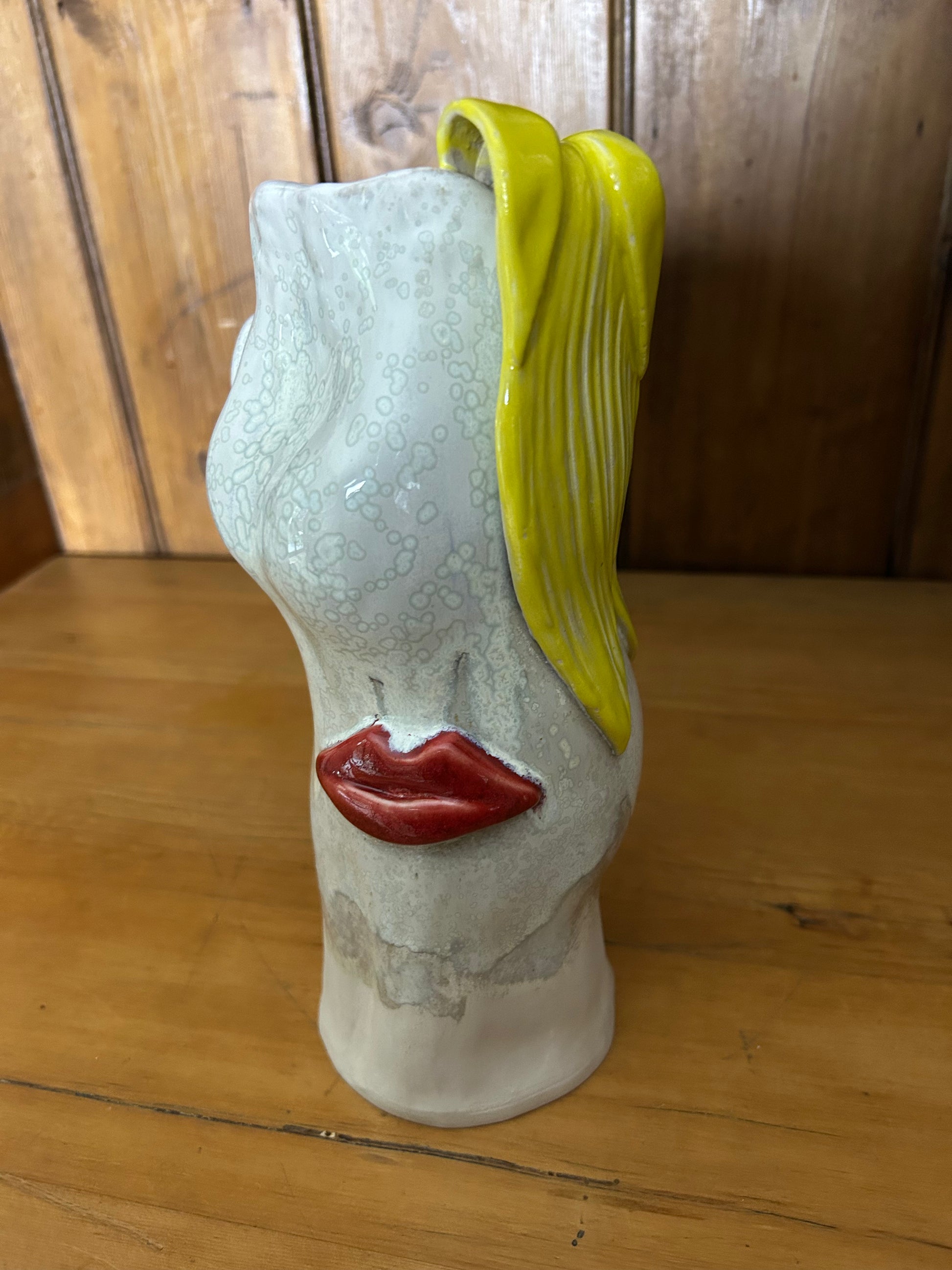 A shapely vase inspired by "my first kiss". Hand built and glazed with elderflower white with yellow hair and bright red shiny lips. Made from stoneward clay.